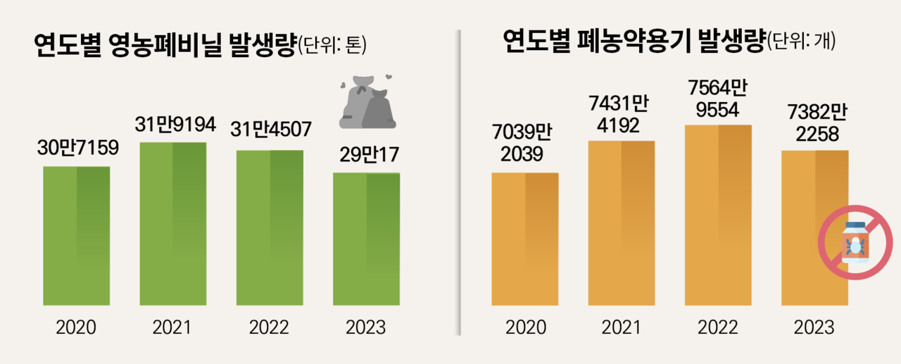 한국환경공단의 최근 통계 자료에 따르면 2023년 기준, 한 해 동안 전국에서 발생하는 폐기물양은 1억7600만톤. 이중 영농폐비닐 발생량은 29만17톤, 폐농약용기 발생량은 7382만2258개로 집계됐다. 영농폐비닐 발생량은 2022년도 발생량보다 7.8%(2만4490톤) 감소했는데, 한국환경공단 관계자는 “비닐 사용주기가 길어지고, 농작물 재배면적도 줄어든 것”을 요인으로 보고 있다. 영농폐비닐 수거량은 20만903톤으로 나타났는데, 통계상 약 9만톤의 영농폐비닐이 수거되지 않고 농촌에 남아 있는 것이다.