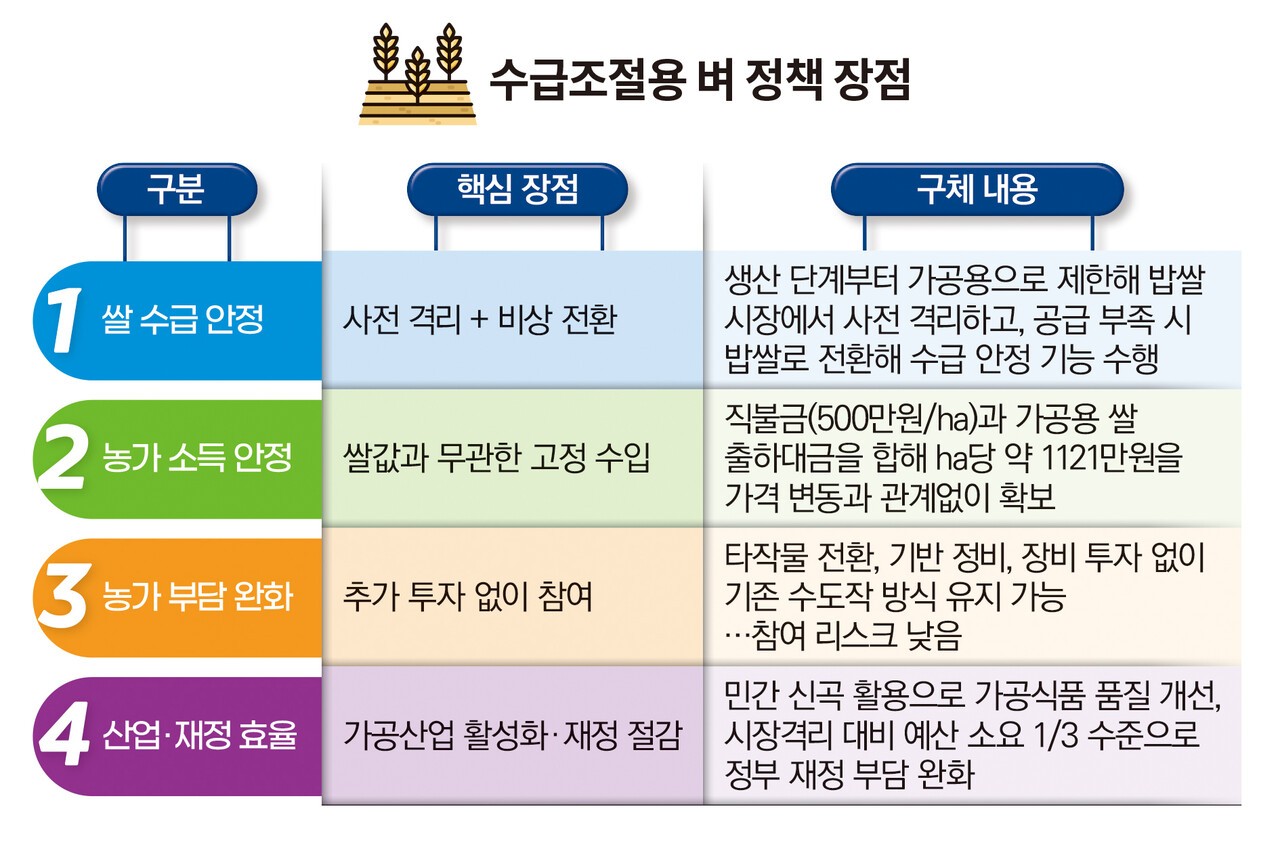 정부 재정 절감 효과도 있다. 민간 신곡을 활용하는 방식이어서 시장격리나 공공비축에 따른 정부 보관·관리 비용을 줄일 수 있다. 1만톤 기준 예산 소요액은 수급조절용 벼가 113억원으로, 시장격리(305억원) 대비 약 1/3수준으로 분석된다.