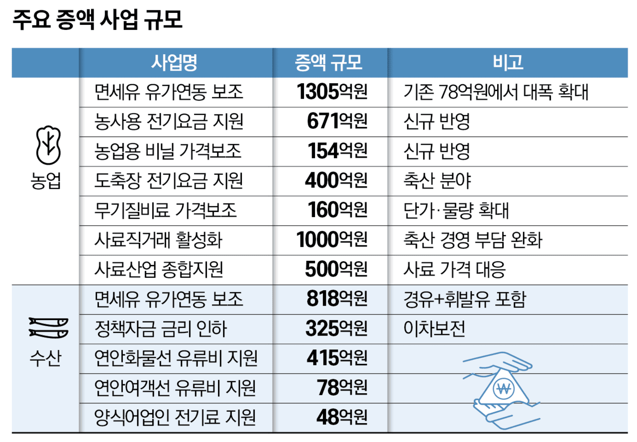 해수부 추경안에도 어업인의 금융부담 경감 및 경영부담 완화 취지의 증액이 요구됐다. 농해수위는 어업인 유가연동 보조금 한시지원(면세경유 759억원, 면세휘발유 59억원), 수산정책자금 금리 인하 지원(이차보전) 325억1000만원, 연안화물선 유류비 보조 415억4600만원, 연안여객선 유류비 지원 78억1300만원, 항만물류 비상 대응 104억8200만원, 호르무즈 해협 봉쇄로 인한 국적선박 피해 148억원, 양식어업인 전기료 한시지원 48억3700만원 등을 각각 증액했다.
