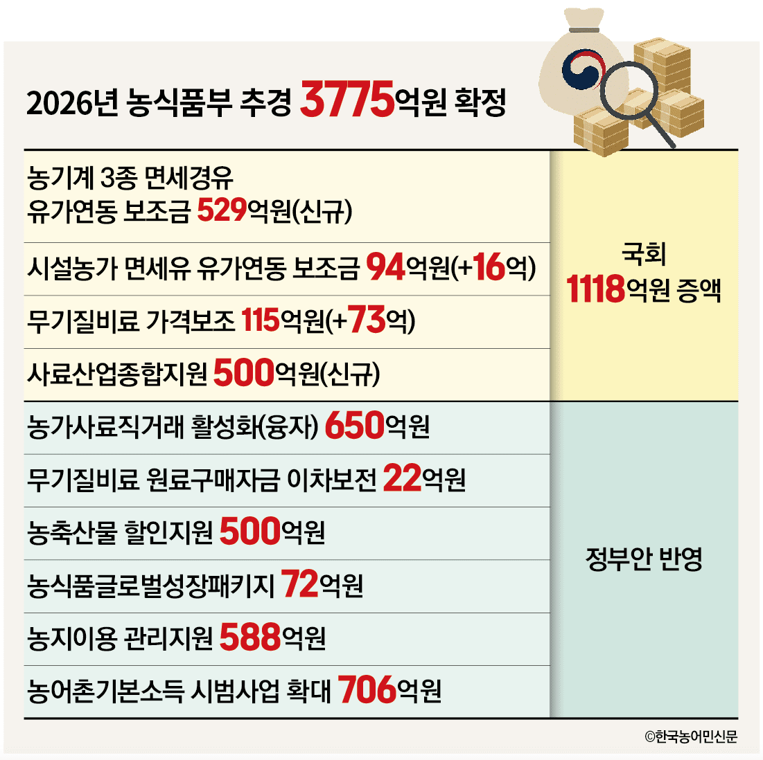 중동전쟁 대응을 위한 정부 추가경정예산(추경)이 확정됐다. 최종 반영 예산은 농림축산식품부 3775억원, 해양수산부 1448억원으로, 국회에서 생산비 지원 예산이 일부 보완됐으나 농업용 전기요금 지원 등 중요 피해 대책이 반영되지 않아 아쉽다는 반응이 나온다.